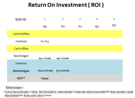 Sekarang mari kita tinjau dari lembaga pendidikan yang paling kecil seperti Bimbel (Bimbingan Belajar) di perumahan. Tidak jarang bimbel kecil seperti ini pendapatannya bisa melebihi dari bimbel dengan sistem franchise yang ternama atau terkenal. Menghitung rancangan balik modal seperti Break Even Point (BEP) atau Return Of Investement (ROI) untuk bimbel pada dasarnya sangat mudah. Berikut adalah gambaran umum BEP dan ROI Bimbel secara garis besar :
