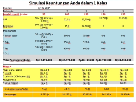 Sekarang mari kita lihat perkiraan pendapatannya. Jika 1 murid bimbel biaya belajarnya adalah Rp. 225.000 per bulan, maka pendapatan kita untuk kelas senin/kamis saja adalah Rp. 225.000 x 50 murid , yaitu Rp 11.250.000 per bulan. Keseluruhan kelas, maka tinggal di kali 3, yaitu Rp. 33.750.000,- Hal ini belum termasuk dengan biaya pendaftaran, biaya modul belajar dan lainnya. Dengan membuka kursus sendiri tanpa franchise, maka kita juga bisa mengatur sendiri biaya-biaya tersebut. Kita juga bisa membuat paket per 6 bulan (1 semester), per tahun dan sebagainya. Paket pun bisa kita atur dengan berbagai system pembayaran, bisa diangsur, bisa cash dan sebagainya.