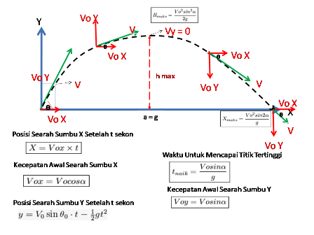 - atau gerak jatuh bebas pada arah vertikal (sumbu Y) seperti h = 1/2 g.t kuadrat , Vt = g. t